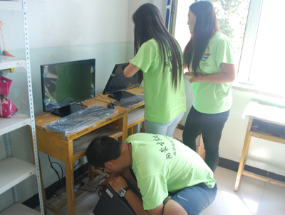 为深入学习贯彻党的十八届三中全会精神,组织引导广大青少年学生深入社会、深入基层,在接受锻炼的过程中了解国情区情,在服务基层的过程中长才干、做贡献,培育和践行社会主义核心价值观,计算机与信息工程学院特组建了计算机与信息工程学院2014年“学习右玉精神、成就青春梦想”暑期社会实践直属队。来自计算机院的17名实践队员深入山西省右玉县参加了为期六天的暑期社会实践,7月13日从队员接过学院党委副书记王永江老师的实践队旗的那一刻起,实践活动正式开始。短短的六天时间里,先后开展了计算机与信息工程学院文化下乡捐赠电脑仪式,帮助右玉县第一完全小学完成信息系统建设和局域网的组建工作,与右玉县第一完全小学签订了内蒙古农业大学社会实践基地建设协议并建立长期合作关系,邀请农大附中刘俊副校长就我校附小和附中的办学经验和理念与右玉中小学校负责人进行交流与座谈,参观了展现右玉19任县委书记60多年来带领广大人民与大自然抗争、艰苦奋斗、坚持不懈地改善生态环境的“右玉精神”展览馆,全程徒步25公里参观了南山植树造林区,深入到社区、广场进行计算机基础知识普及、做了关于“中国梦”的近500份调查问卷、深入到“光荣院”志愿服务并捐赠衣物等活动。