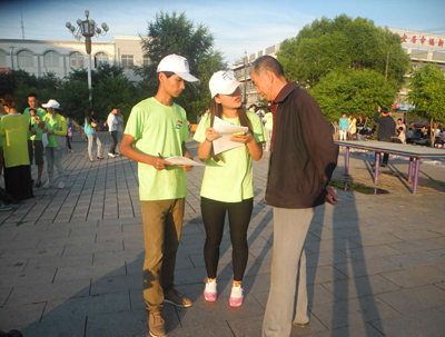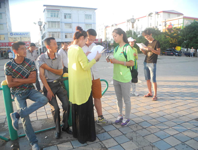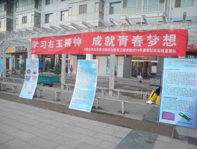 (通讯员 王越)黄昏将至,一群身着绿色半袖的大学生们现身于右玉县的各个广场上,手中拿着一份份调查问卷,对来往的右玉人民做着问卷调查。在夕阳的照射下将“内蒙古农业大学暑期社会实践队”照的光亮无比。 在活动的过程中,十七名同学分为两组,一组负责对来往的行人进行主题为“中国梦”问卷调查,另一组负责在广场上进行IT知识的宣传。同学们拿着调查问卷,耐心地向过往的行人询问关于“中国梦”的一些认识与见解,并对其做了一些简短的记录。不过多时几百份调查问卷就在同学们的努力下对过往的行人们调查完毕,然而做IT宣传的同学们也都在为每一位上前观看的路人一一讲解,为他们解说关于IT方面的知识。