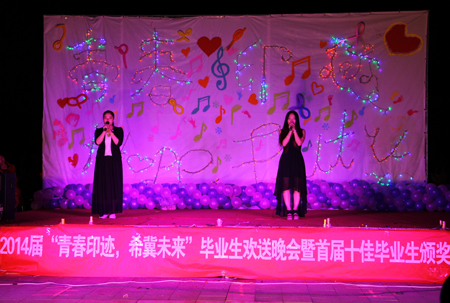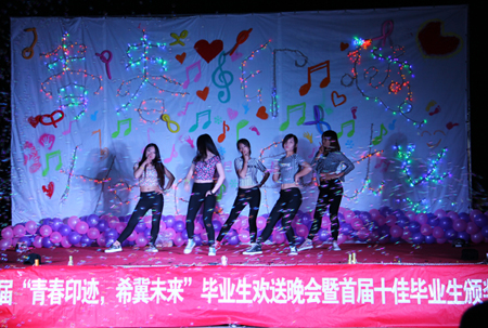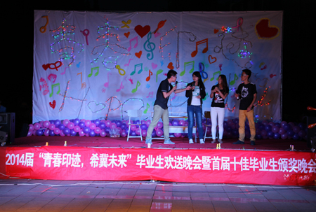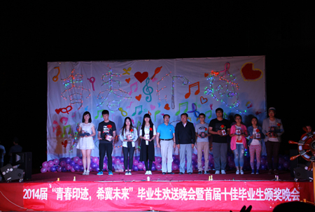 母校最大的幸福在于培养了一批优秀的大学毕业生,晚会上为我院“十佳毕业生”进行颁奖,他们分别在为学院或学校做贡献、科技创新、文艺、学术等方面表现突出,在母校留下了他们的专属印记,为同学们树立了榜样,为学院争夺了光彩。