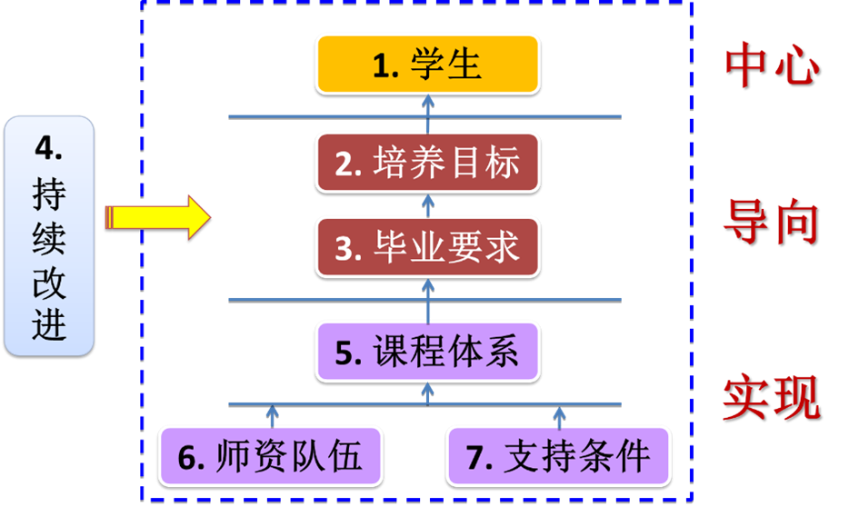(3)Continuous Quality Improvment持续改进(CQI)理念:强调专业必须建立有效的质量监控和持续改进机制,能持续跟踪改进效果并用于推动专业人才培养质量不断提升。通过发现人才培养过程中存在的需要改进和完善的质量问题,形成监控、反馈、改进的闭环管理,提高人才培养质量。(建立“评价-反馈-改进”闭环,形成持续改进机制。)